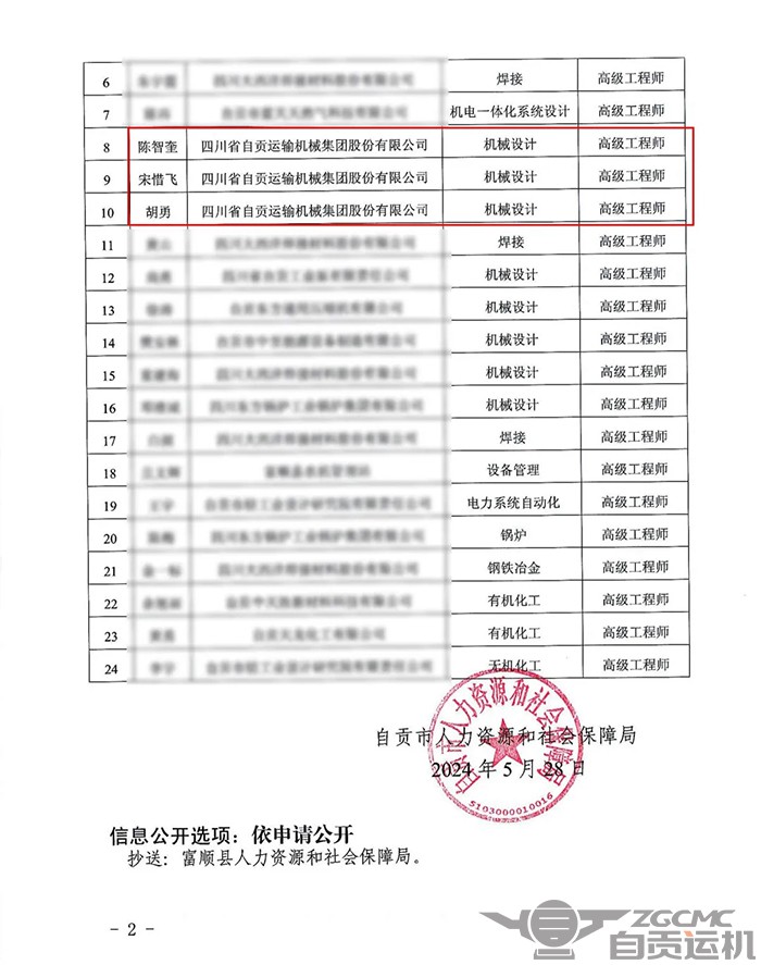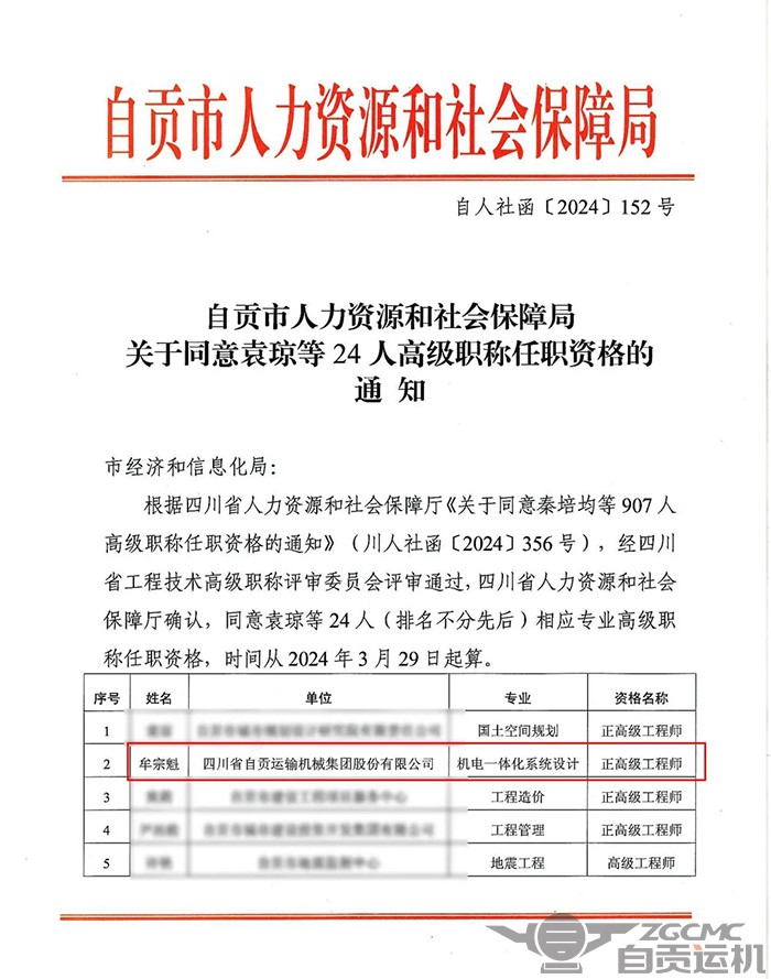 近日,自贡市人力资源和社会保障局发布关于高级职称任职资格评审通过的通知。经四川省工程技术高级职称评审委员会评审通过,四川省人力资源和社会保障厅确认,运机集团的牟宗魁成功通过正高级工程师评审,陈智奎、胡勇、宋惜飞三位同事也顺利获评高级工程师!