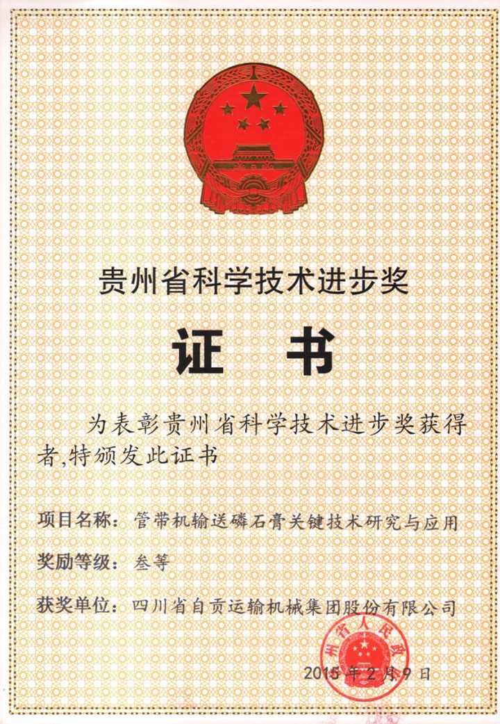 近日,以管状带式输送机为技术核心,并结合了磷石膏过滤系统,尾部分料系统、尾部临时堆场和头部转接堆料系统等设计技术,四川省运输机械集团股份有限公司与贵阳开磷化肥有限公司联合研发的“管带机输送磷石膏技术研究与应用”项目荣获2014年度贵州省政府科学技术进步三等奖。在此,公司项目做出贡献的部门和个人表示衷心的祝贺,并希望再接再厉,在股份公司二零一五创新年中,新产品开发、技术进步和专利申报等方面取得更大的成绩。