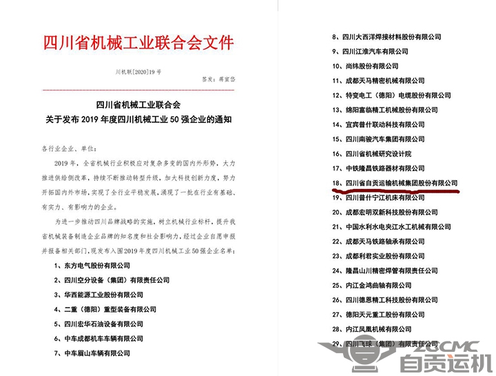 2020年12月16日,四川省经信委、四川省机械工业联合会发布信息通报“2019年全四川省机械工业50强企业”名单,我公司榜上有名,这也是我公司连续多年被授予“四川省机械工业50强企业”。