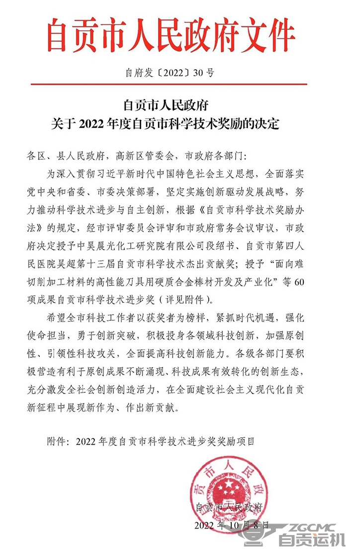 10月8日,自贡市人民政府为深入贯彻习近平新时代中国特色社会主义思想,全面落实党中央和省委、市委决策部署,坚定实施创新驱动发展战略,努力推动科学技术进步与自主创新,授予了一批“2022年度自贡市科学技术进步奖”。