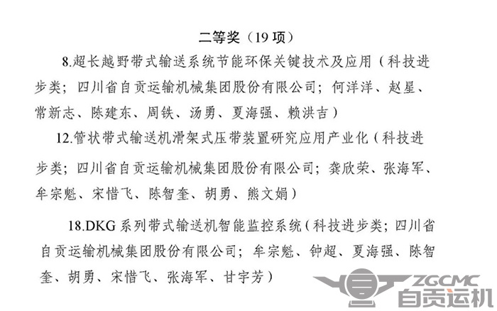 运机集团的三项科技成果荣获科学技术进步奖二等奖,分别是:何洋洋、赵星等人的《超长越野带式输送系统节能环保关键技术及应用》,龚欣荣、张海军等人的《管状带式输送机滑架式压带装置研究应用产业化》,牟宗魁、钟超等人的《DKG系列带式输送机智能监控系统》。