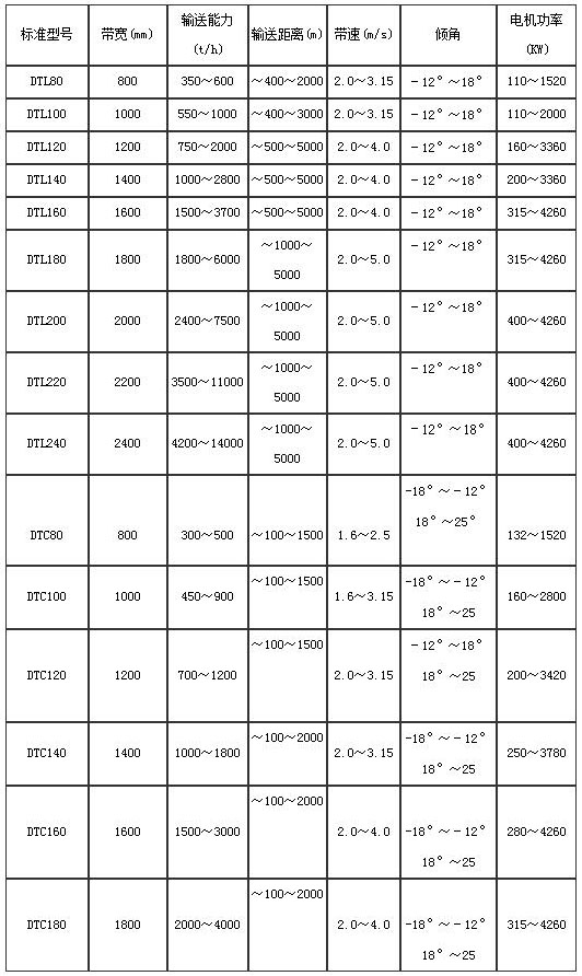 大倾角带式输送机,该机型采用平面输送带配深槽型托辊组、软起动装置,实现大倾角输送, 大上运倾角达+25°;下运带式输送机根据具体情况,或设置阻尼装置、或电机反馈制动、或配置专门阻尼制动器、可调制动力矩液压盘式制动器和特殊阻尼设施等,其 大下运倾角达一18°;软启动装置能保证在启动时自动调节控制速度,使启动加速度保持在0.1~0.3m/s2。之间。驱动装置中配有液力推杆制动器和NF逆止器,确保输送机安全制动和防止逆转。承载托辊组为四节或五节托辊组成的深槽形托辊组;输送带采用阻燃型钢绳芯胶带,并配有各种安全保护,确保输送机正常运行。