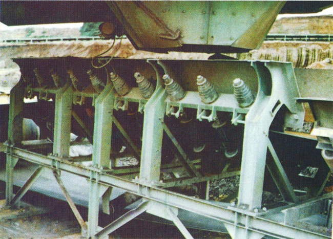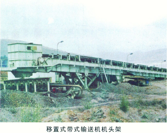 移置式带式输送机是露天矿连续开采和半连续排岩所需的专用带式输送机,常与斗轮挖掘机配合在采面或与排土机配合在排土场使用。在采面上,移置式带式输送机铺设的线路与采面平行,斗轮挖掘机挖下的物料通过移动式加料台车卸到输送机上运走。当采面推进一定距离后,输送机必须相应横移以便继续受料,此时,安装在可移动台架上的移置式带式输送机的头架和尾架通过专门的装置移动,而中间架每3~4m一段,安置于滑撬形钢枕上,钢枕由在输送机两侧沿全长敷设的钢轨连成一体,钢轨也是加料台车的行走轨道。输送机横移时,卸空物料并松开输送带,拆除拉紧头架和尾架的钢丝绳,移道机沿输送线路分段横向拉曳钢轨,钢轨依次被吊起、拉曳而发生局部弹性变形实现横移。移设完成后重新固定。
